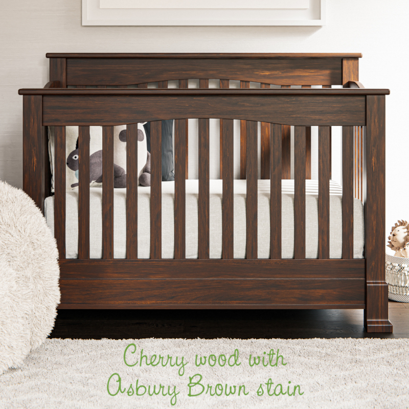 Our Amish Montana Slats Convertible Baby Crib, first image shown here in Brown Maple with Almond stain, is beautifully handcrafted in the USA by skilled Amish craftsmen. Our American made baby furniture is made of solid wood harvested responsibly in the USA. Our solid wood 4 in 1 baby cribs are convertible & can grow with your child into toddler beds, day beds & full beds. Our 4 in 1 convertible baby cribs come with a heavy duty, powder coated crib spring that is also made in USA. Our American made baby cribs are available in your choice of standard or formaldehyde free finishes & paints. Made in Indiana.