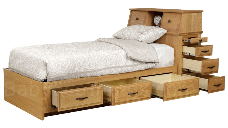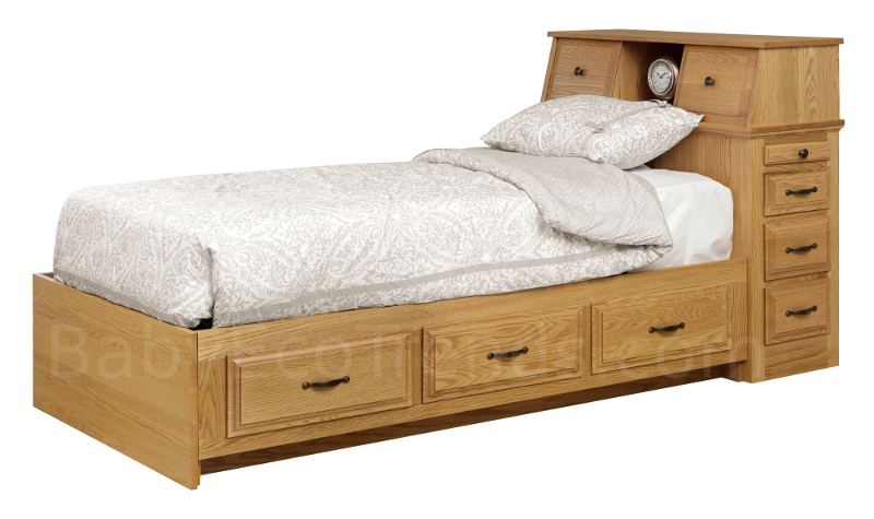 Our Amish Tyler Storage Platform Bed, shown here in Red Oak, is hand made in the USA and features a bookcase in the headboard and several storage drawers that make it ideal for a small bedroom or dorm room. Our USA made children's storage bed fits a standard size mattress, has full extension drawer glides and is available in Twin, Full, & Queen sizes. Our American made children's furniture is made entirely of solid wood harvested responsibly in the USA. Made in Pennsylvania.