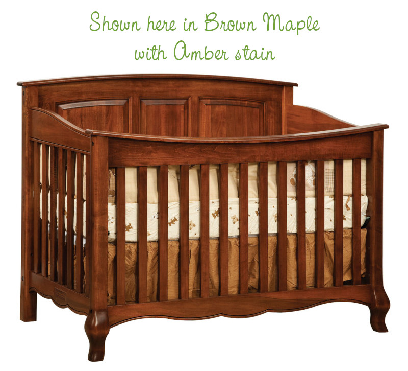 Our French Country Slats Convertible Baby Crib is beautifully handcrafted in the USA by skilled Amish craftsmen. Our American made baby furniture is made of solid wood harvested responsibly in the USA. Our solid wood 4 in 1 baby cribs are convertible & can grow with your child into toddler beds, day beds & full beds. Our 4 in 1 convertible baby cribs come with a heavy duty, powder coated crib spring that is also made in USA. Our American made baby cribs are available in your choice of standard or formaldehyde free finishes & paints. Made in Indiana.